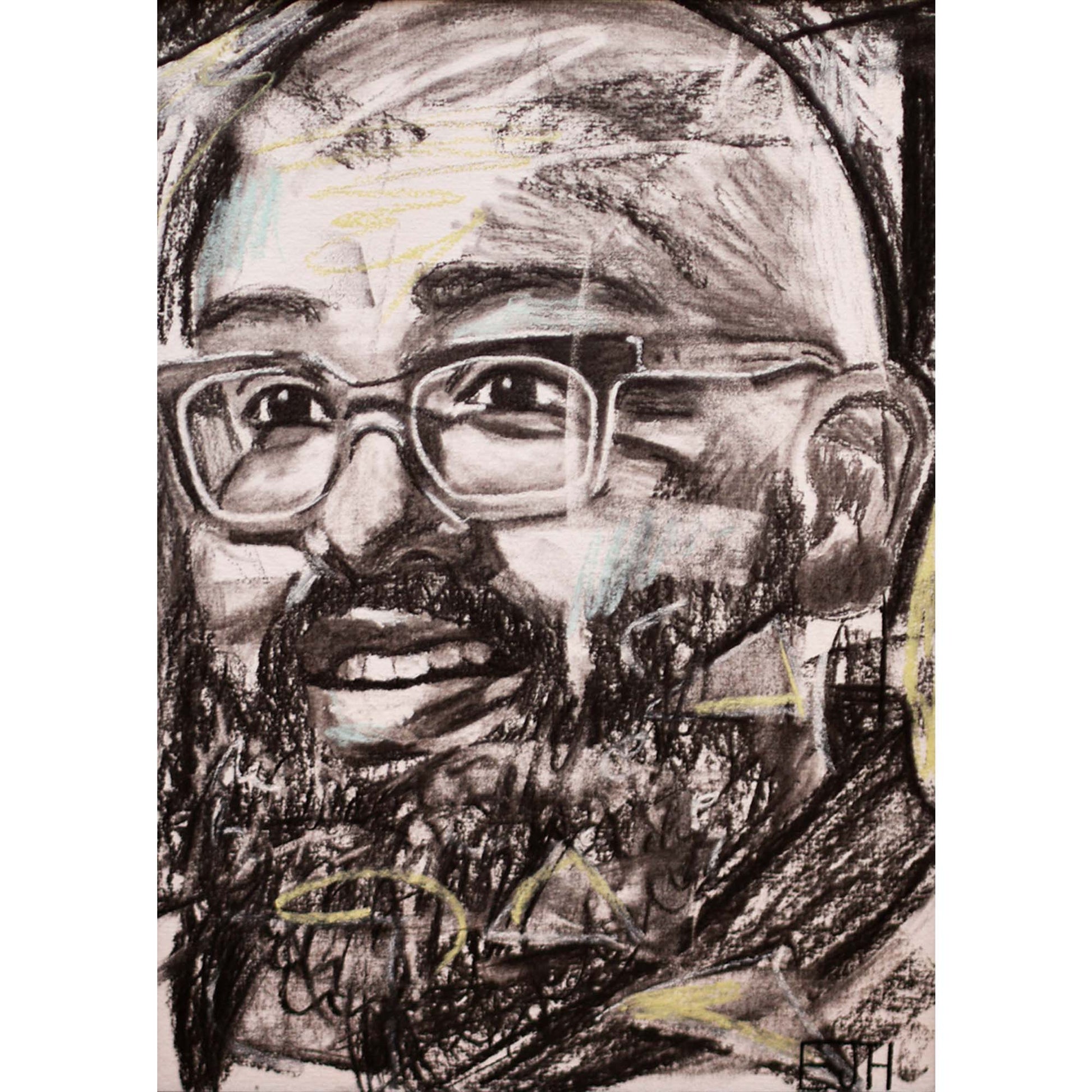 This charcoal portrait of singer-songwriter Adrian Eagle captures the creative spontaneity that defines his music. Edward embraced an erasure technique to enrich the drawing with depth and emotion. Rich, dark tones frame Adrian’s face, drawing the viewer into an expression of awe and fulfillment. His wide eyes and uplifted gaze reflect a moment of introspection, an acknowledgment of his journey and the success he’s carved out as a singer-songwriter.