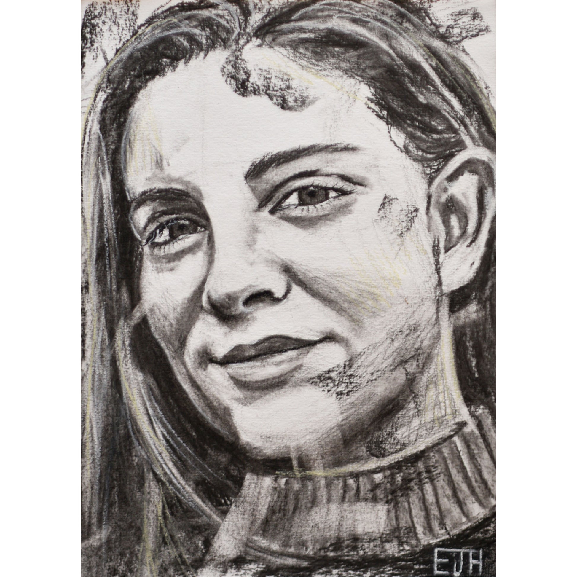 This charcoal portrait captures Adrienne’s soft expression. Edward set out to capture the authentic, emotional presence of her. Using charcoal to sculpt her features, he allowed the natural whites of the paper to illuminate her form. Rapid, abstract marks surround the portrait, adding a sketch-like quality that embraces the spontaneity and rawness of the medium.