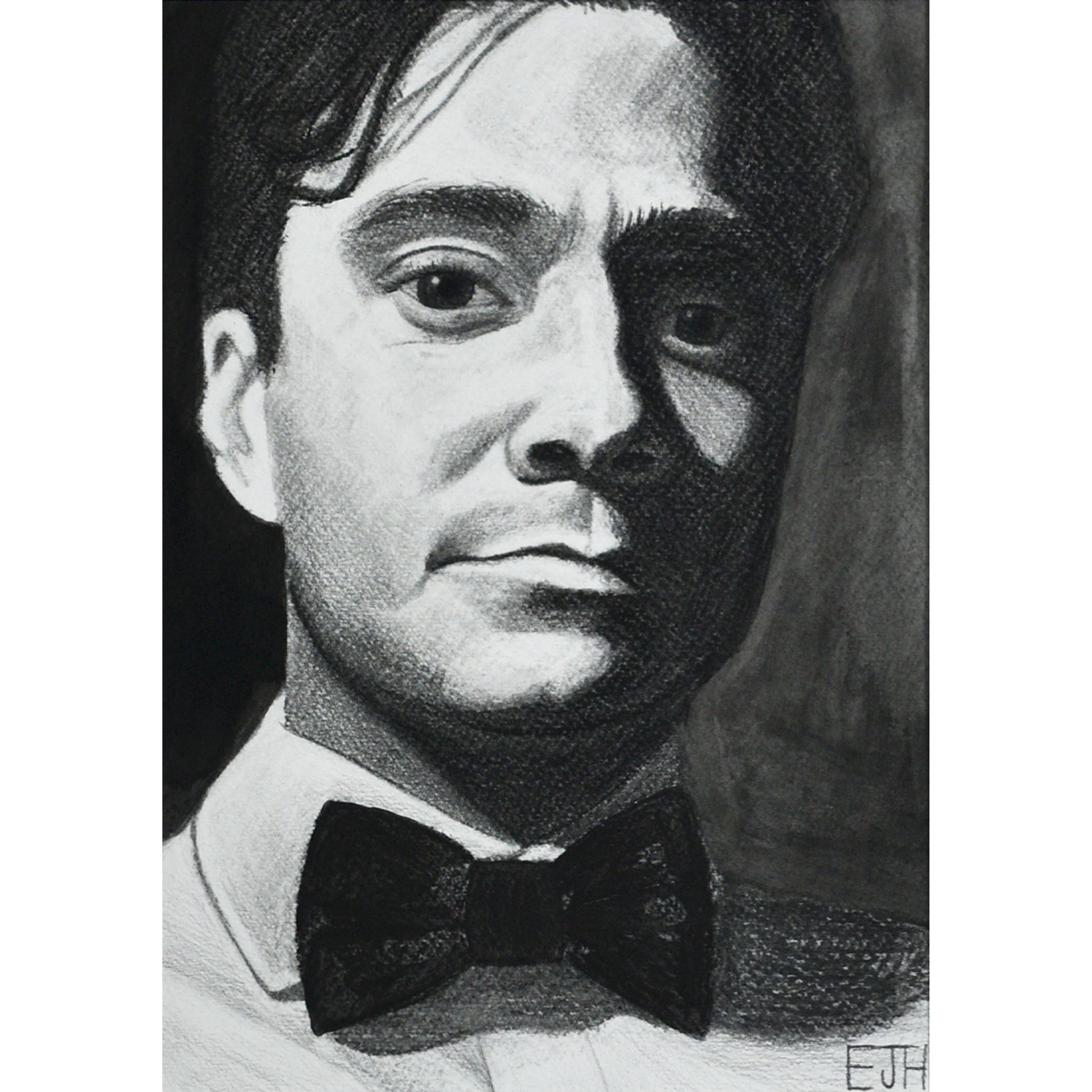 This self-portrait draws inspiration from 1940s film noir photography, a style known for its dramatic low-key lighting and striking contrast in both photography and cinematography. To recreate this effect, Edward positioned a handheld light in front of him at a low setting, then refined multiple photographs in Photoshop by enhancing the brightness and contrast. In this drawing, Edward captured his sincere expression, dressed in a white dress shirt and a satin black bowtie. Using graphite pencils, charcoal sticks, and ink, he gradually built up rich dark tones while allowing the white of the paper to create illumination.