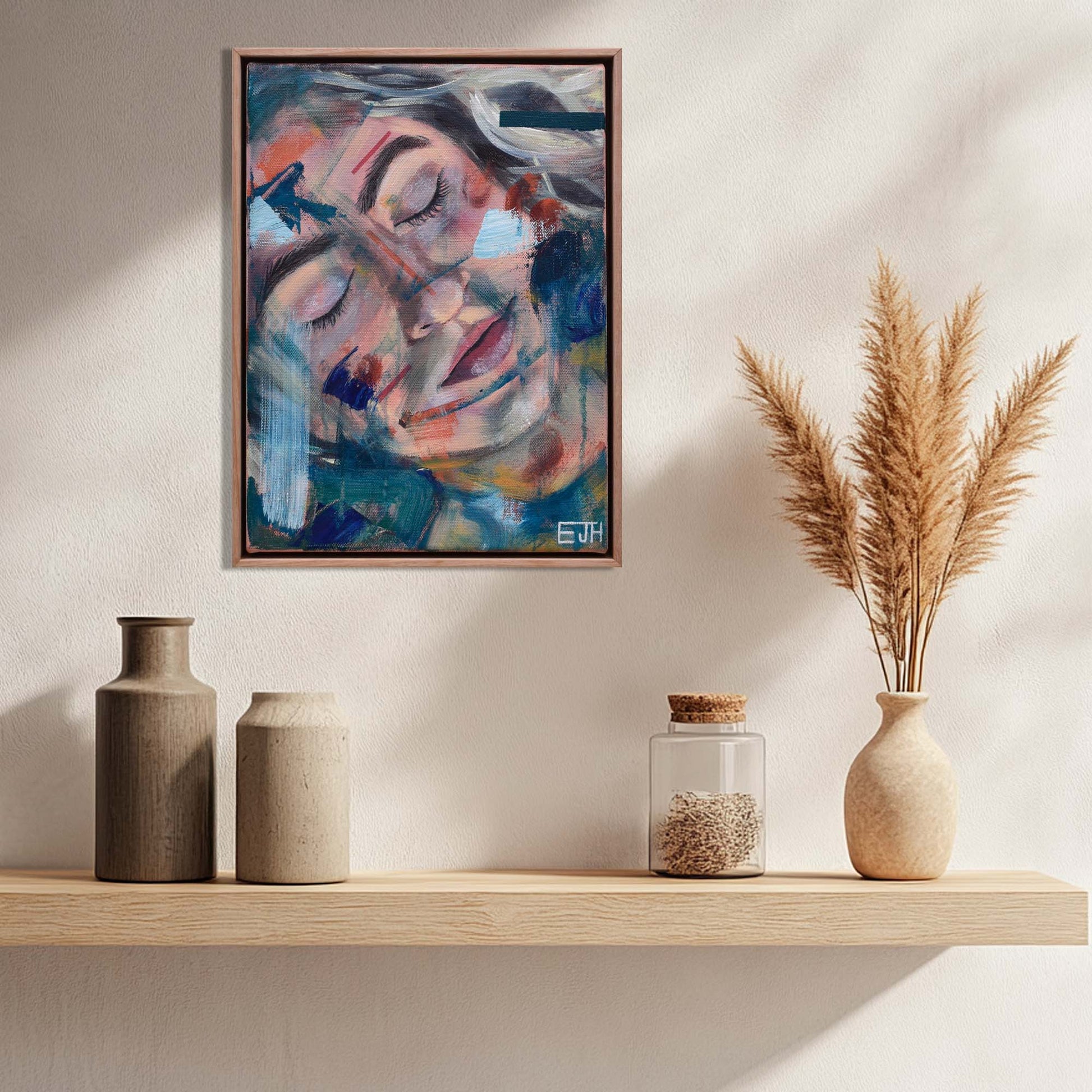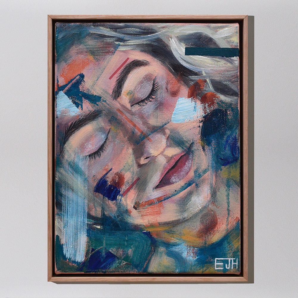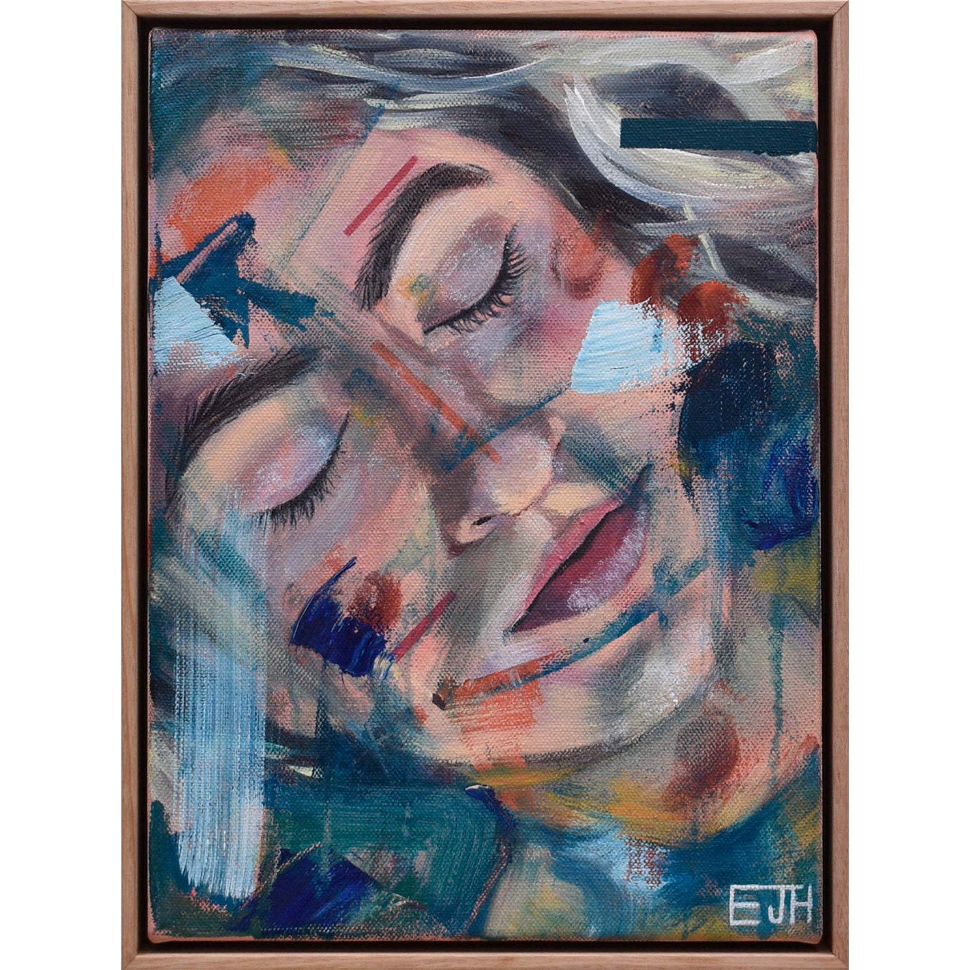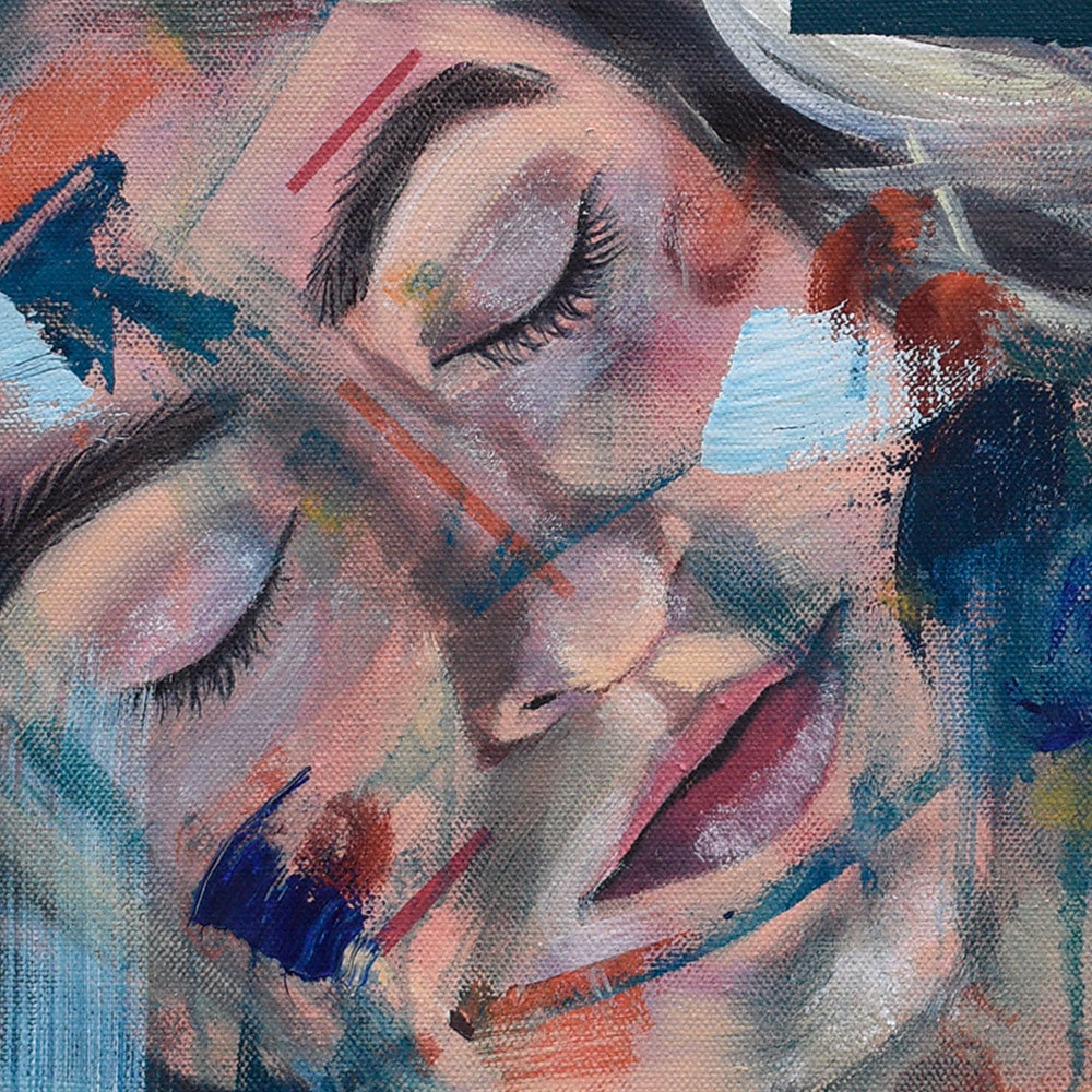 This portrait conveys Laura’s introspective and meditative state, with her closed eyes evoking a sense of tranquillity and inner peace. The composition is enriched by a dynamic array of abstract elements, including sweeping brushstrokes, bold hard-edged shapes, and expressive blotches of colour. These marks contrast with her calm and meditating expression as if she is in a moment of cleansing.