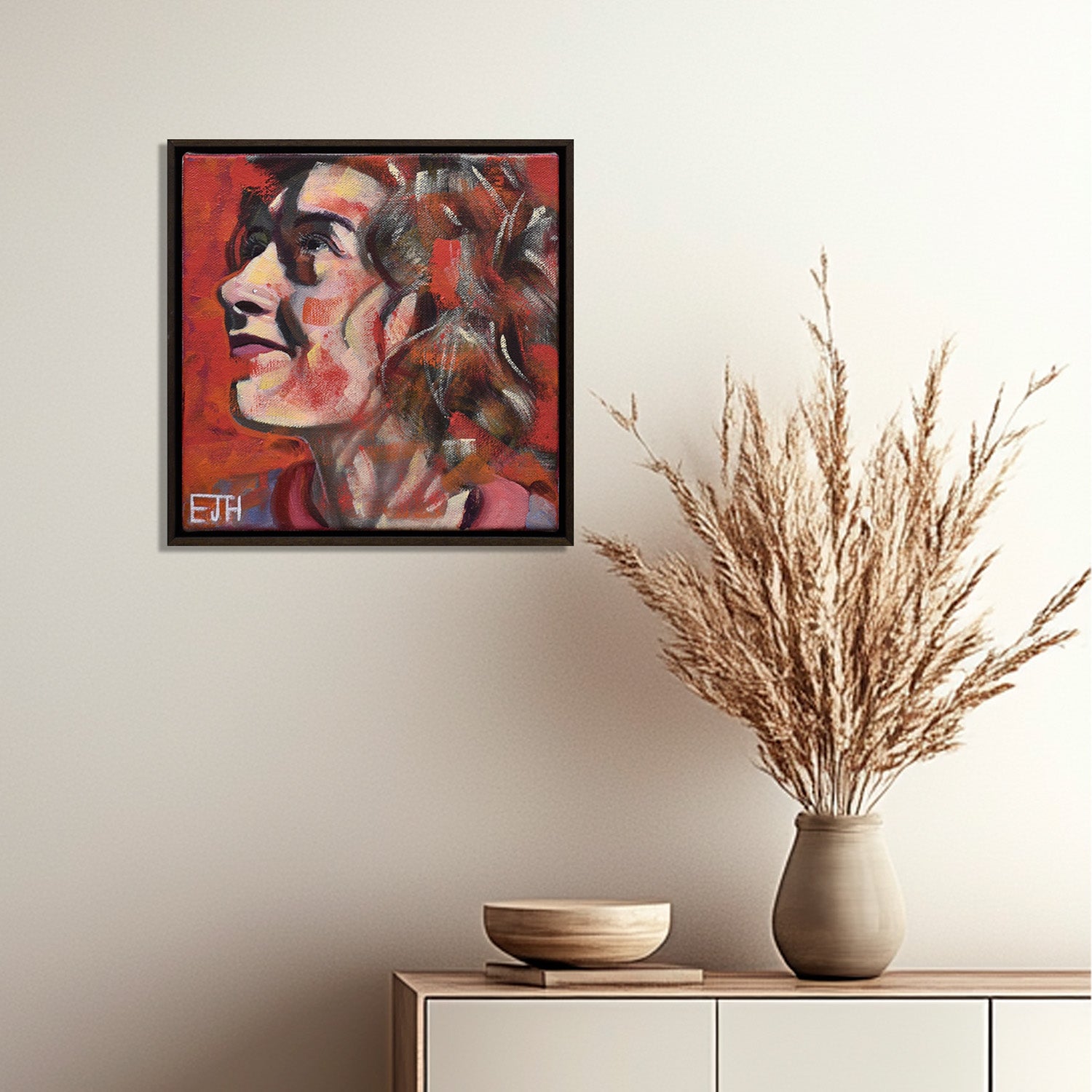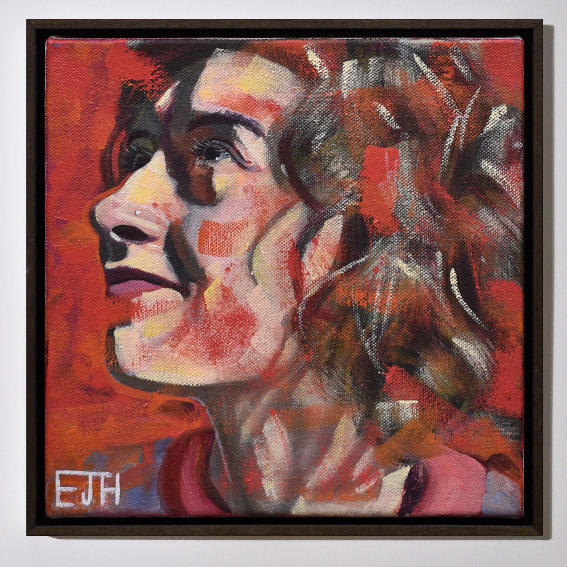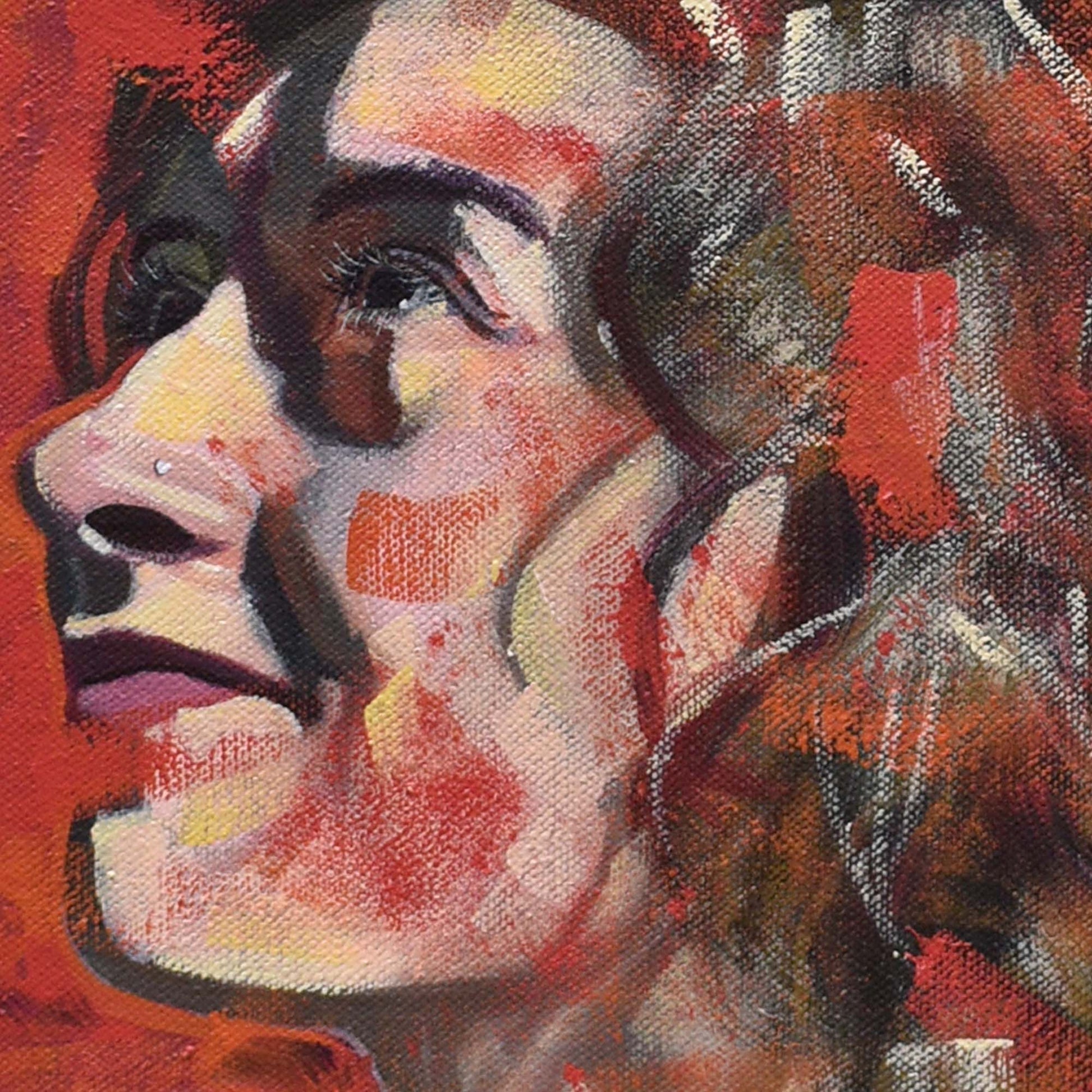 This expressive portrait of a Karina captures a delicate balance between melancholy and joy, her upward gaze suggesting hope or quiet contemplation. The fiery red background dominates into the portrait with bold, textured brushstrokes, evoking warmth and emotional depth. There is this layered approach to flesh and form, with echoes of structural intensity and abstract energy that merges portraiture and feeling in a uniquely tender, introspective composition.