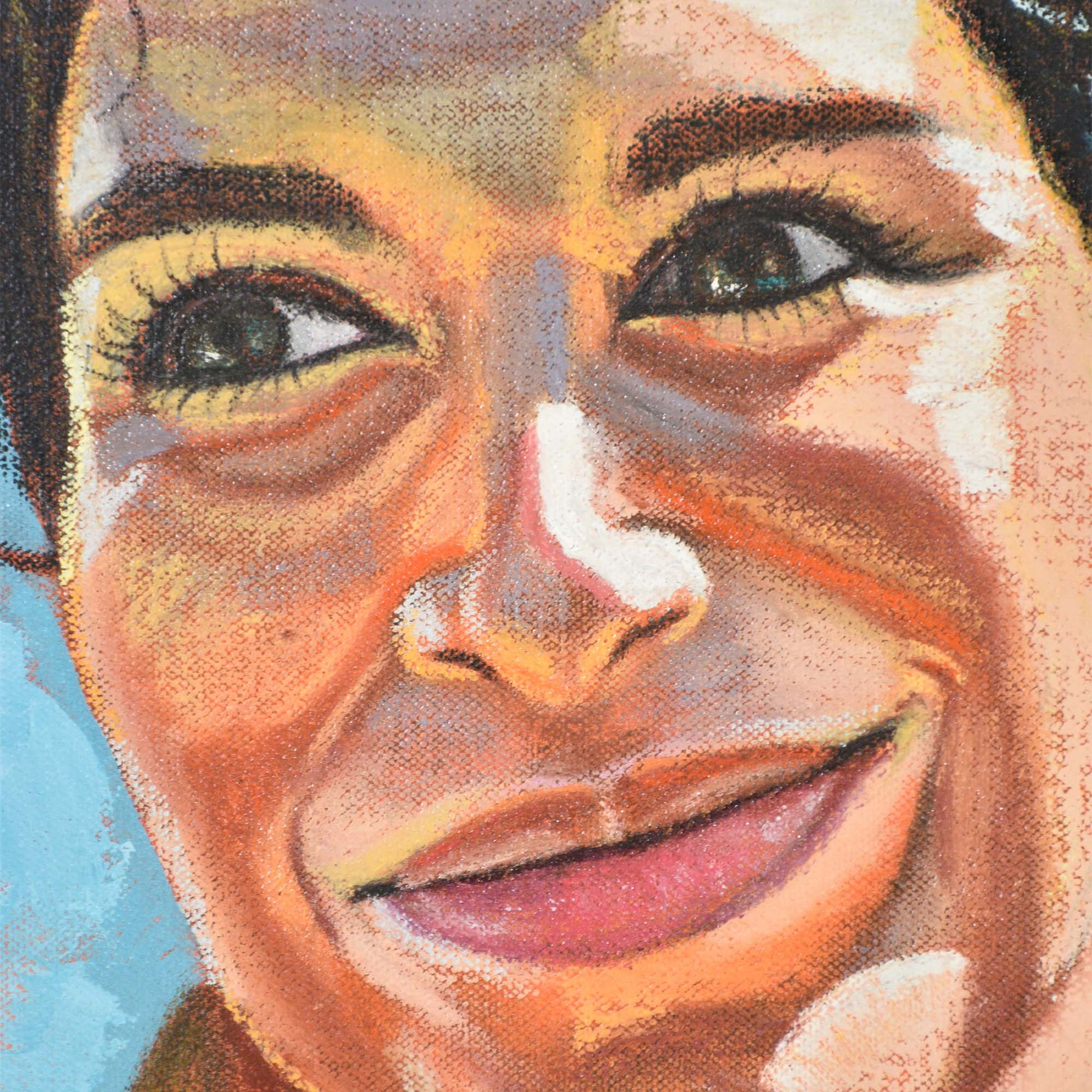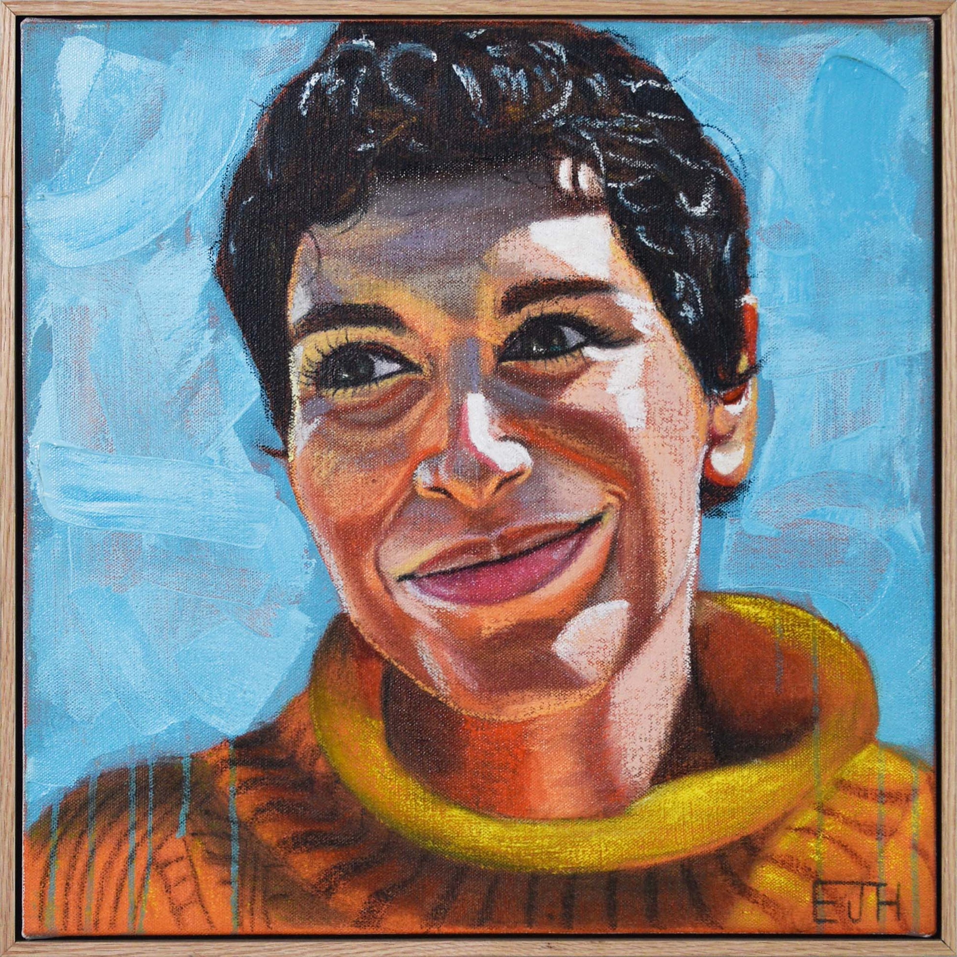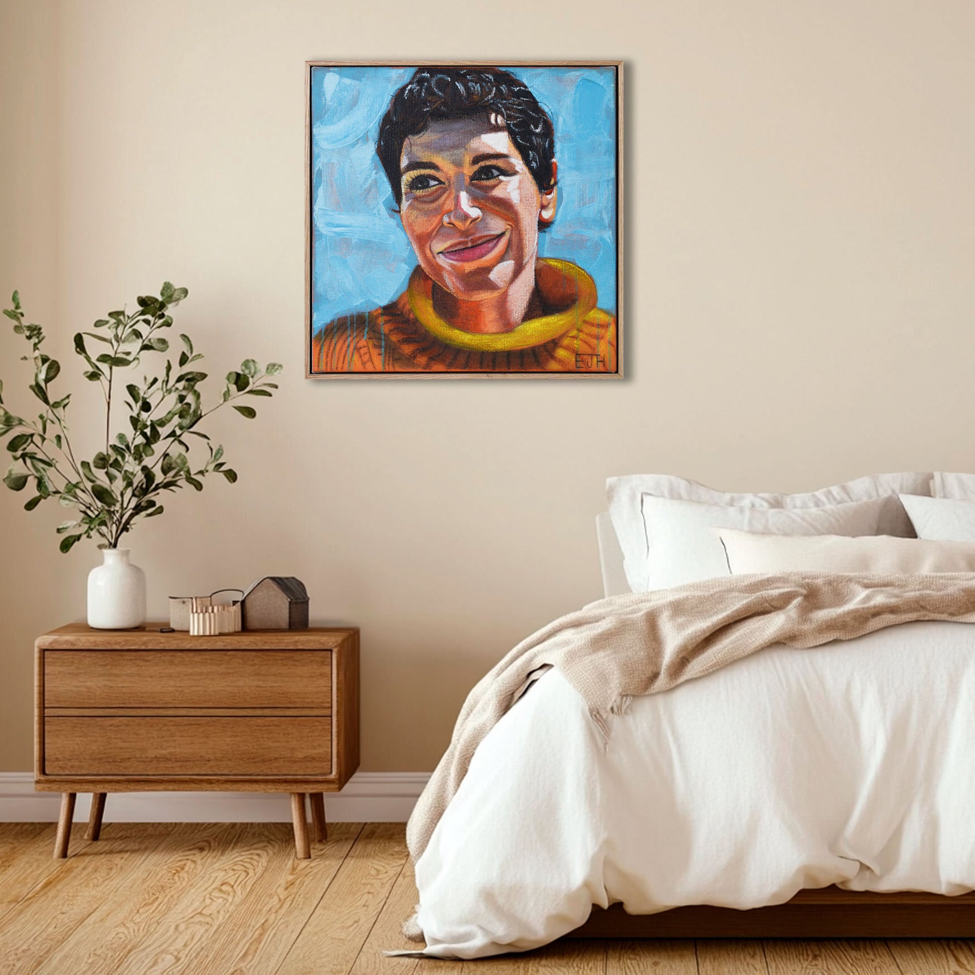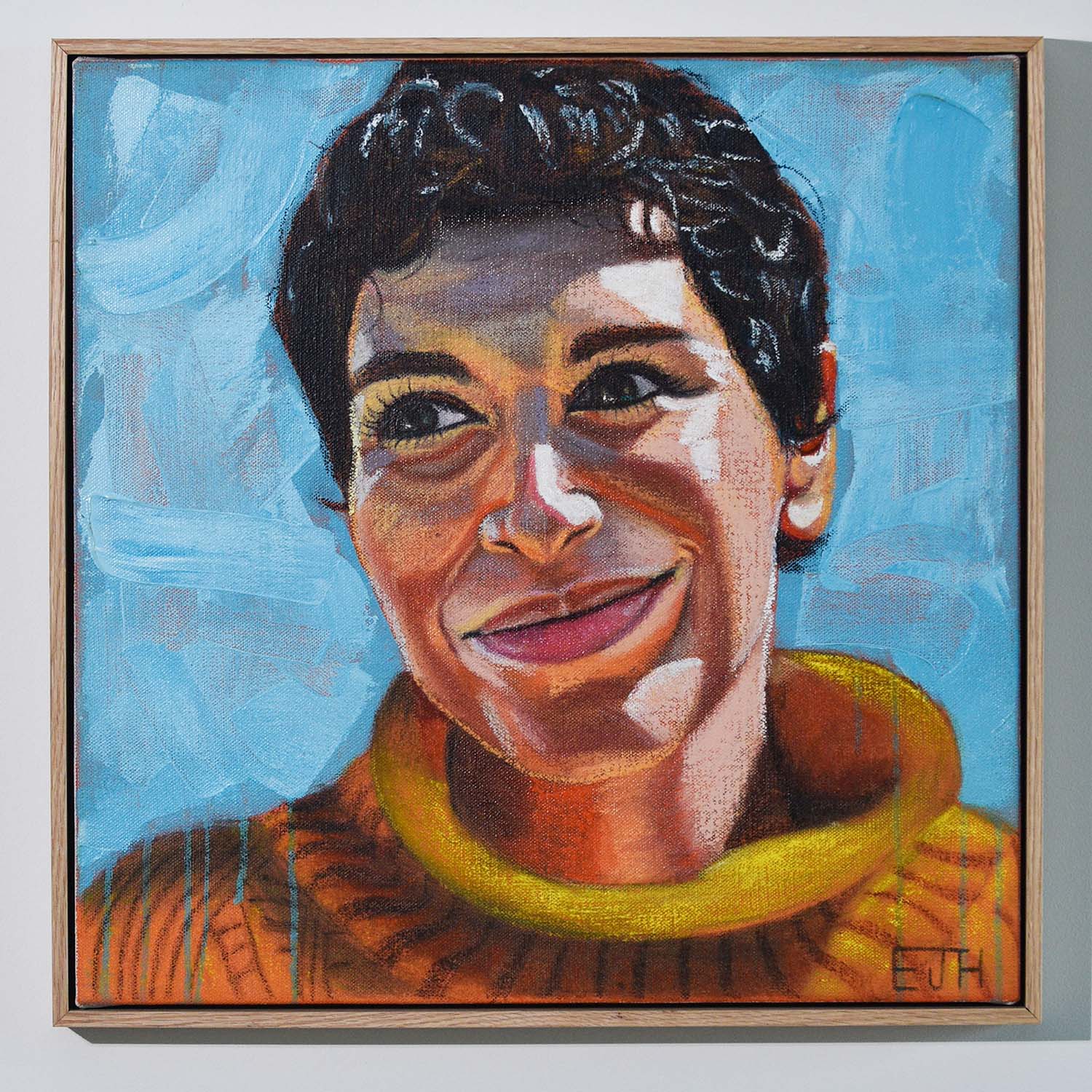 This portrait captures actor Nicole Chamoun in a yellow-orange sweater with a warm smile. Highlights in her hair and on her skin create a sunlit, beachy glow, drawing viewers in to observe the depth of her physicality. The sky-blue background, textured with thick palette knife marks, adds liveliness and energy, with touches of colour dripping softly over her shoulder. These form a lively contrast to the introspective pose, celebrating Nicole’s warmth and presence while inviting a closer, more tactile engagement with the painting itself.