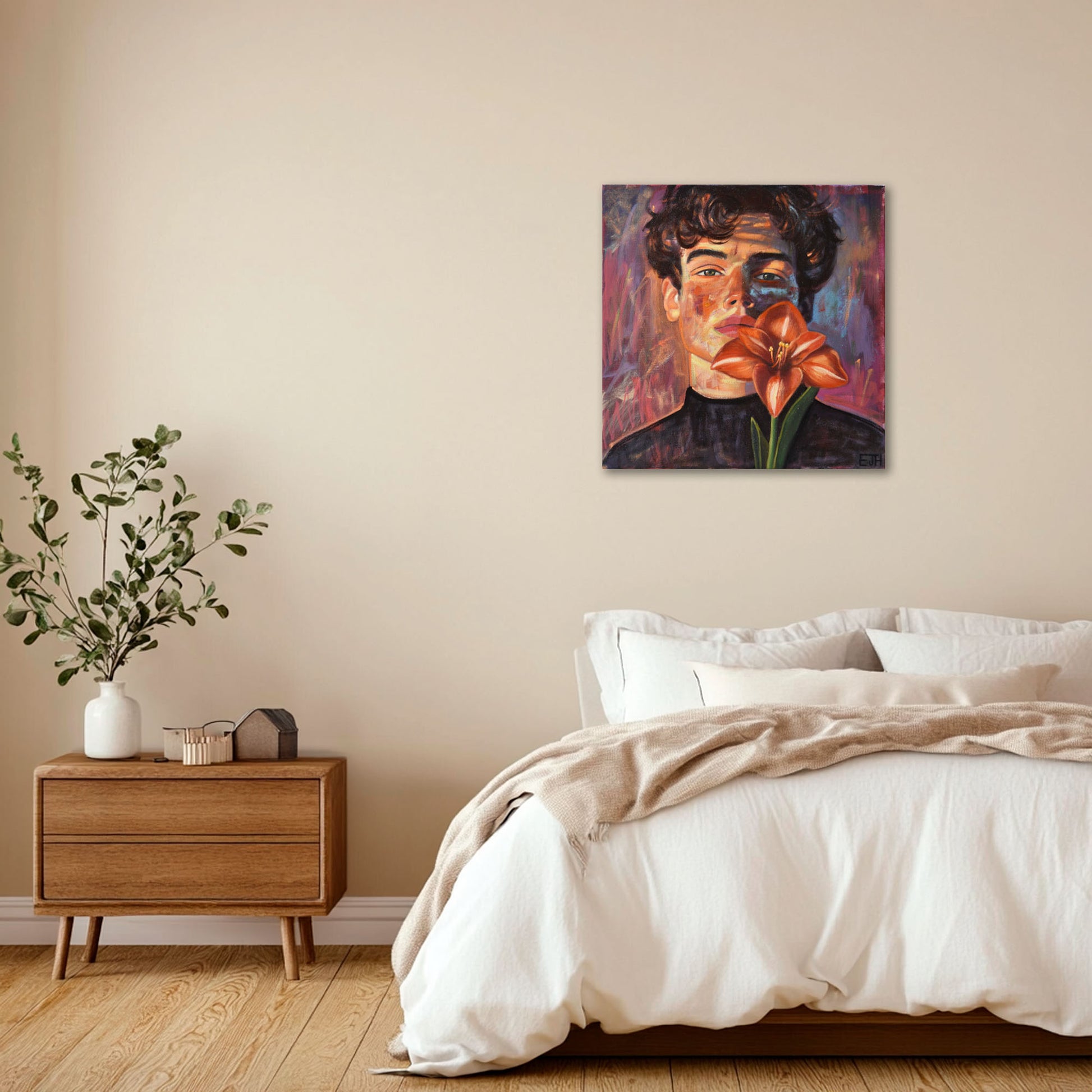 This portrait depicts a young man with an amaryllis, bathed in warm sunlight. The fresh, dynamic use of colour flows seamlessly into a vibrant, expressive background, creating a vivid sense of atmosphere. His calm, steady gaze offers a compelling contrast to the surrounding radiance, striking a balance between stillness and energy. Inspired by Jenny Saville’s bold use of thick oil paint to build dimension or obscure tonal values, Edward adopts a similar approach here. Colours from the background subtly transfer into the subject’s cheeks, either naturally absorbed or deliberately placed to heighten contrast and deepen the emotional tone of the piece.