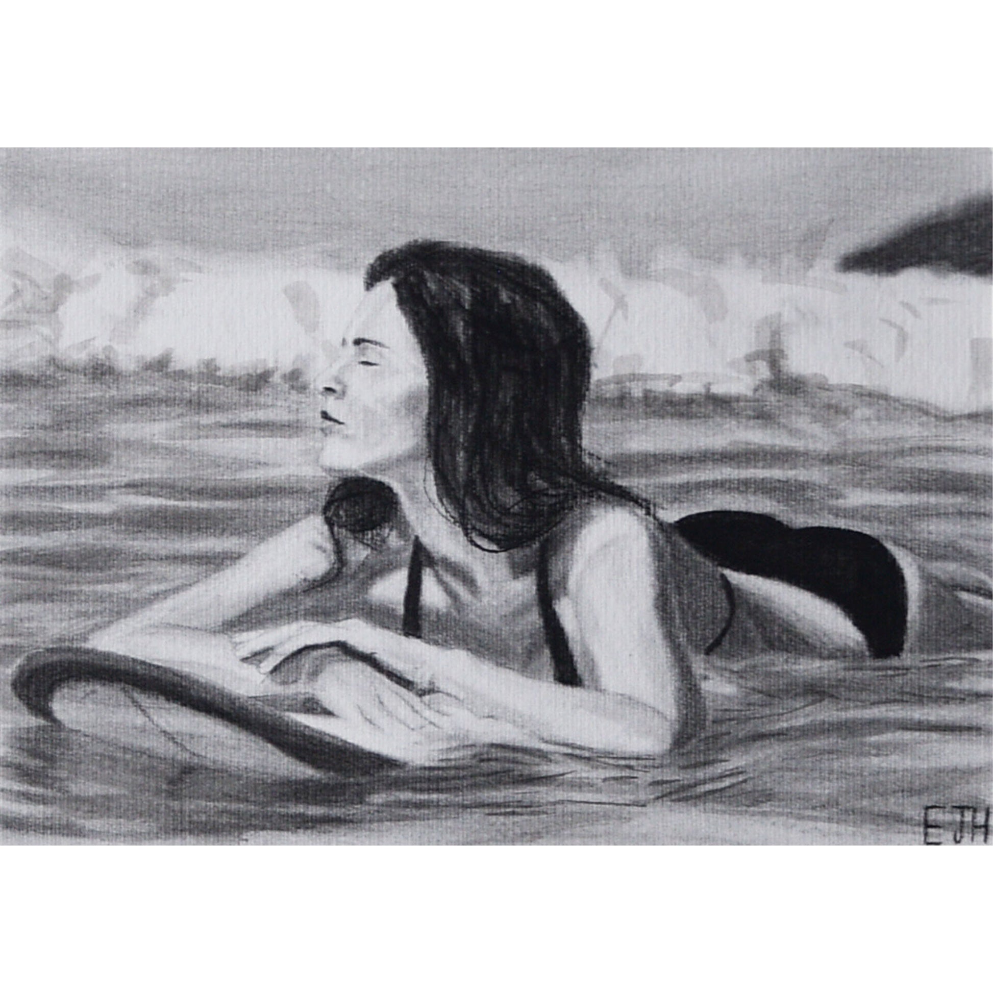In this drawing, Kathryn rests on her surfboard, eyes closed, face turned gently to the sun. She exists in a liminal state between surrender and anticipation just before the arrival of a broken wave. This still moment captures a sense of harmony and balance, a pause where the body and the natural elements of the ocean feel deeply aligned. The ocean is not only picturesque or a background but a presence offering support, stillness and quiet tension of what is to come.