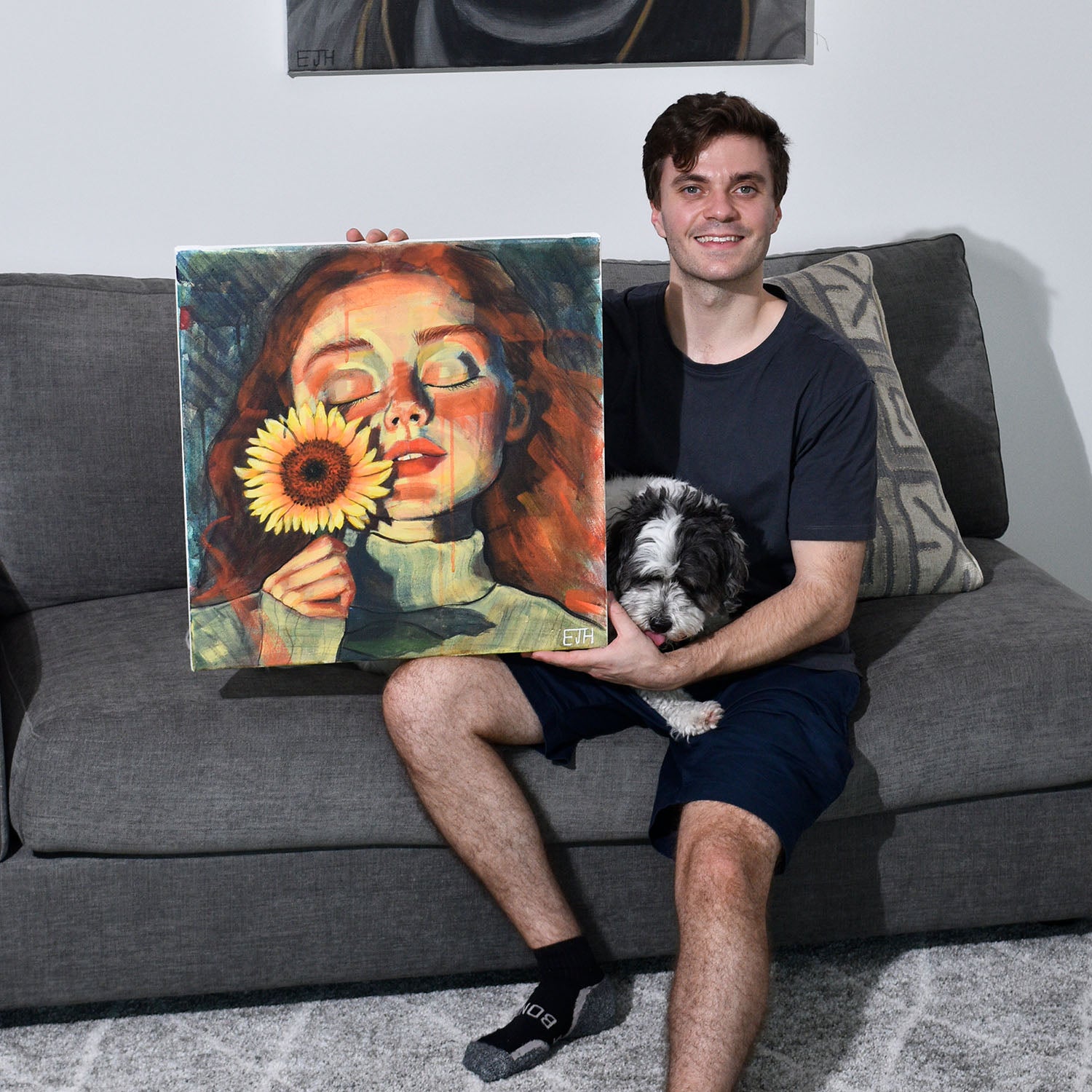 This portrait depicts a girl gently holding a vibrant sunflower, its soft petals brushing against her cheek as she savours their texture beneath the warmth of the sun. The seamless transition of red and yellow hues between the flower and her skin evokes a sense of harmony and balance. Bold, sweeping brushstrokes infuse the piece with energy, while Edward’s nuanced application of colour theory and realism refines this approach, adding depth and dimension to the subject while retaining a playful, almost comical charm.