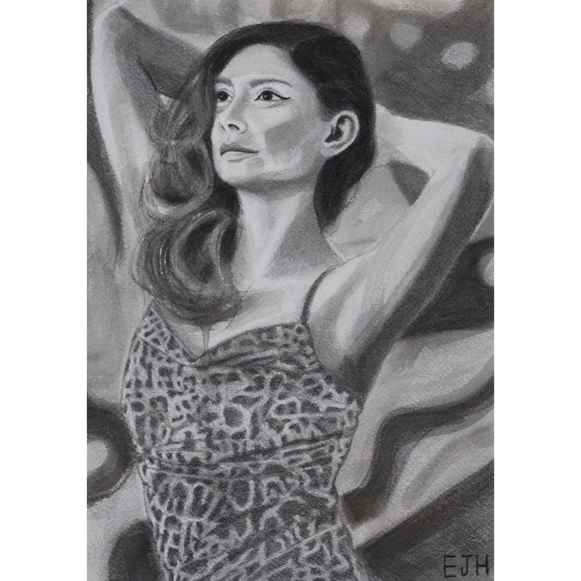 Edward introduced a sense of pattern into the woman’s dress, carefully erasing areas to reveal a constellation of leopard-like spots in the negative space. This technique brings a layered sense of movement and visual texture to the work. Together, these elements create a portrait that feels both steady and full of life, honouring stillness while gently expressing her energy.