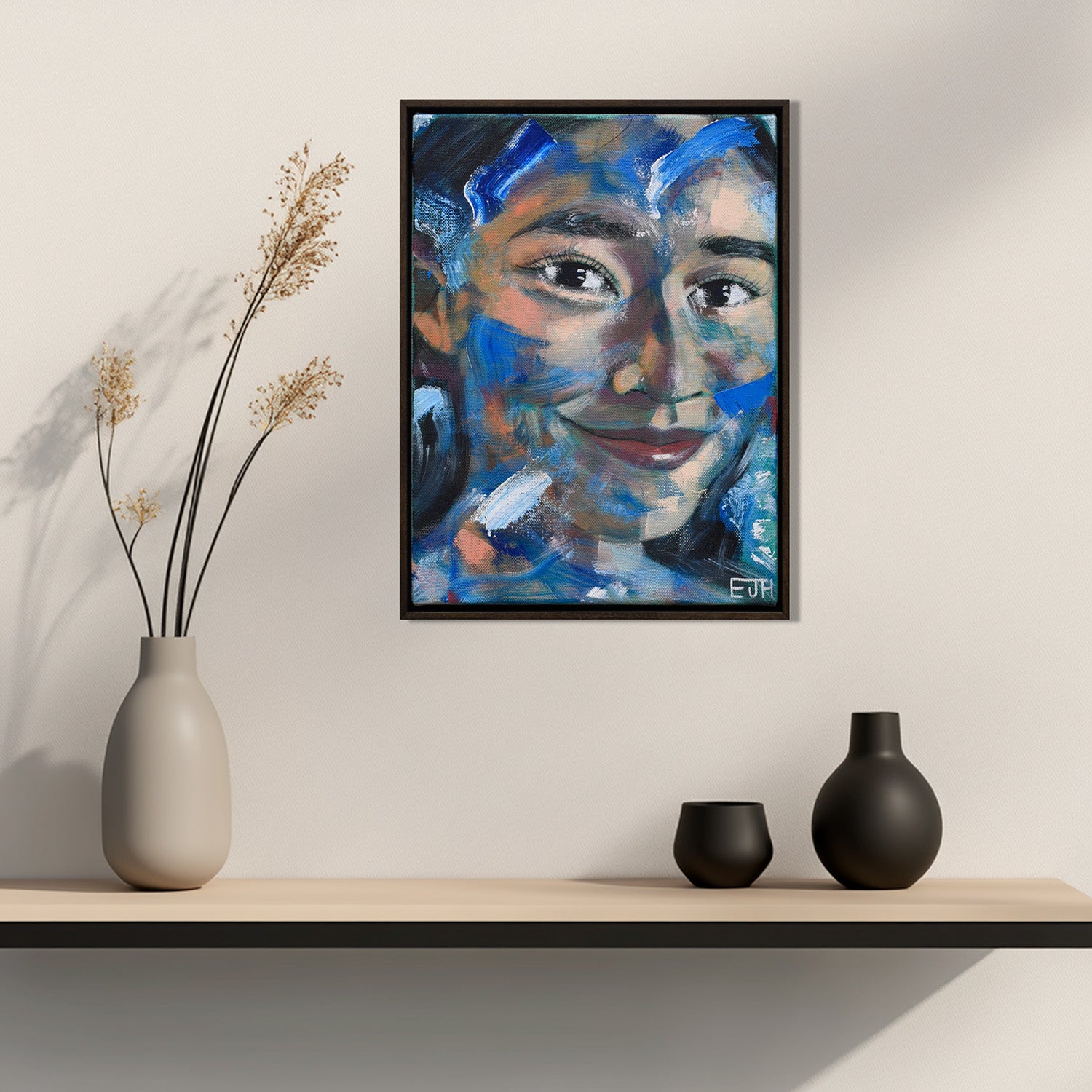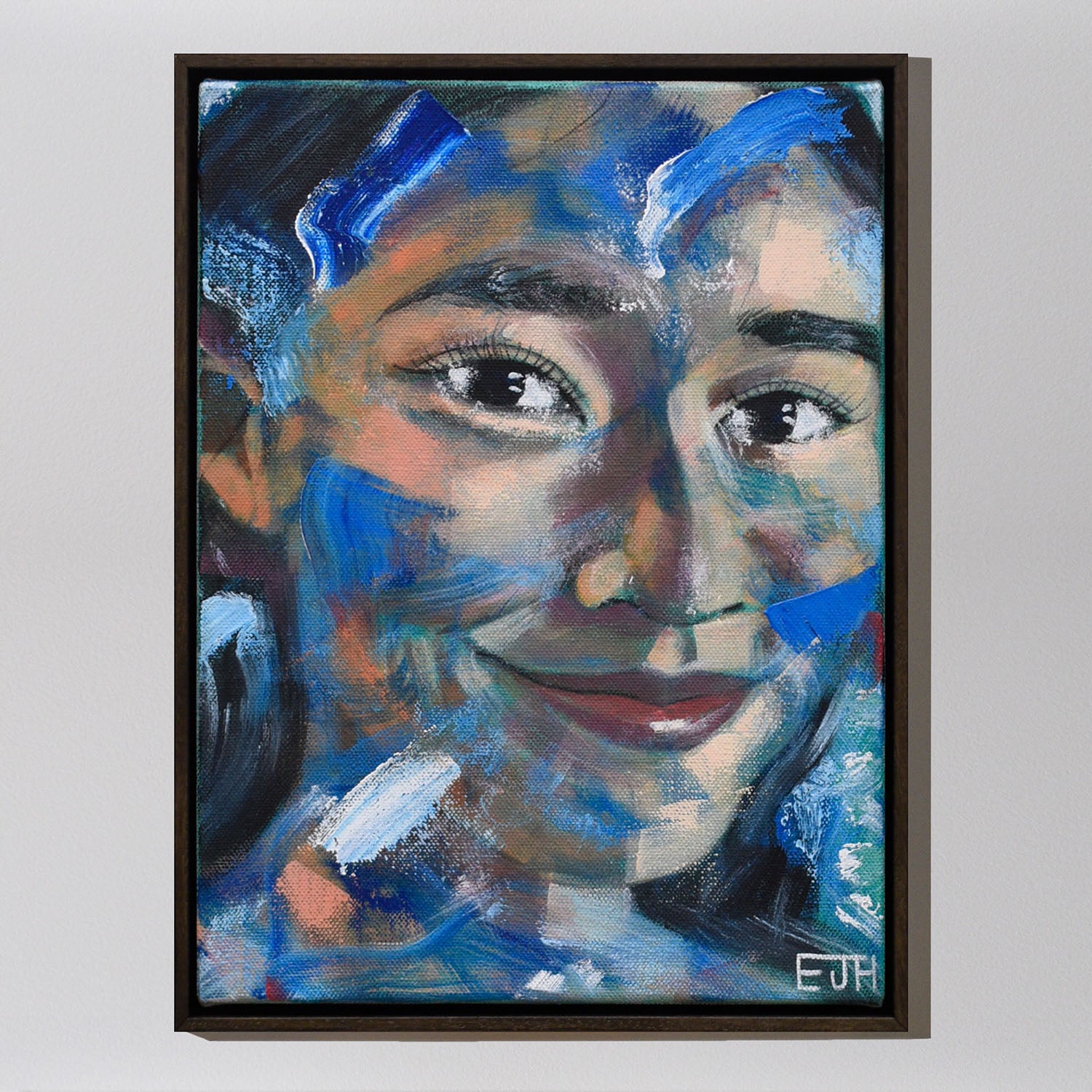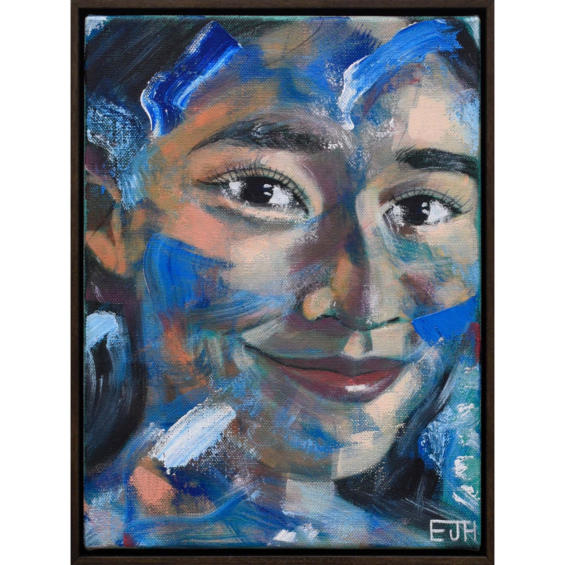This artwork depicts Naomi with an uplifting and happy expression. Edward found deep inspiration in Katsushika Hokusai’s The Great Wave off Kanagawa, particularly its luminous and striking colour palette. He applied loose, expressive brushstrokes, the blues ripple across the canvas, creating a sense of fluidity and motion that mirrors the ever-changing nature of water.